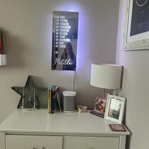 Már vannak dekoratív tükreim, de ez kiemelkedik a személyes érintésével. A testreszabási rendszer egyszerű, és az inspiráló üzenetek megváltoztatják a szoba hangulatát.